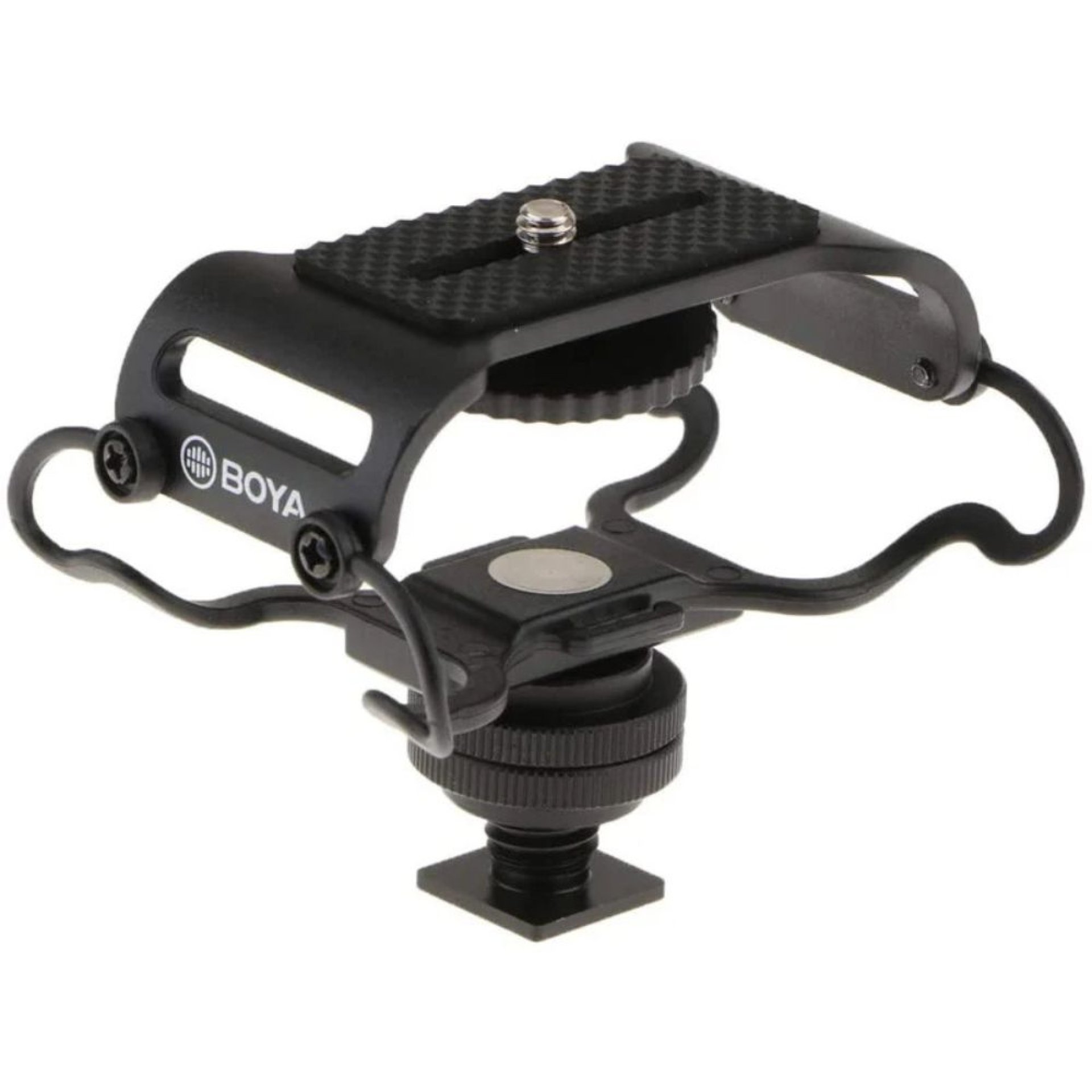 The BOYA BY-C10 features a durable ABS plastic frame with elastic suspension bands that isolate microphones and recorders from vibrations. Its universal cold shoe mount and 1/4" thread make it compatible with cameras, tripods, and other recording setups.
