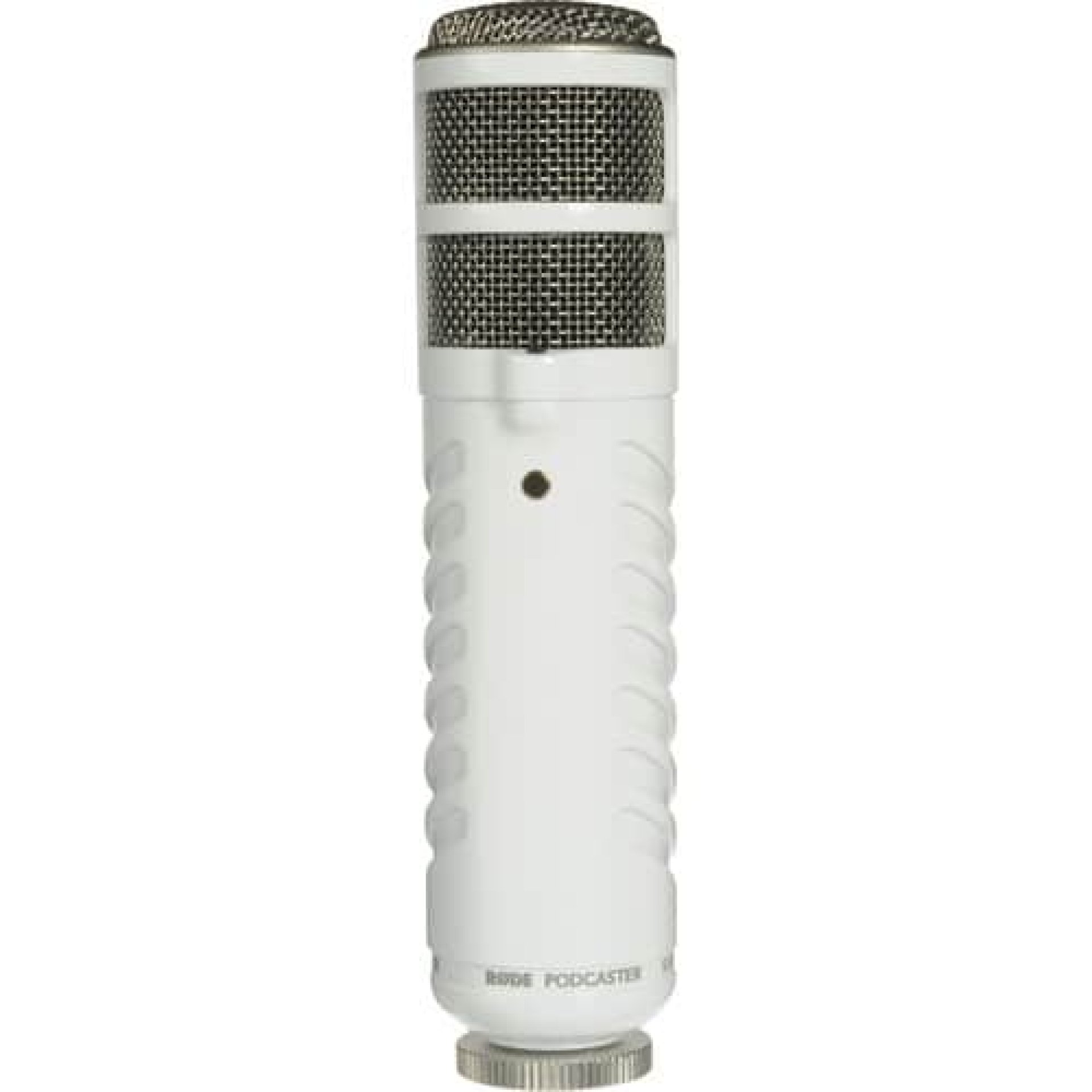 The RODE Podcaster features a sleek, professional design with a durable all-metal body. Its white finish gives it a distinctive look compared to traditional black microphones, making it stand out in studio setups. The microphone is solidly built, ensuring long-term reliability, while its ergonomic design makes it easy to mount on stands or boom arms.